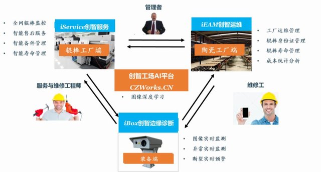 創(chuàng)智工場與輥棒生產(chǎn)企業(yè)了解到輥棒斷裂一直以來都是客戶管控難點(diǎn)和痛點(diǎn),決定共同應(yīng)用創(chuàng)智工場的智能服務(wù)平臺能力建設(shè)AI 輥棒斷棒監(jiān)測系統(tǒng)。陶瓷輥棒壽命管理系統(tǒng)應(yīng)用了創(chuàng)智工場的創(chuàng)智物聯(lián)、創(chuàng)智運(yùn)維產(chǎn)品以及AI平臺開發(fā)技術(shù),整體架構(gòu)如下: 應(yīng)用創(chuàng)智盒子邊緣AI深度學(xué)習(xí)技術(shù),以高清攝像頭為物聯(lián)傳感器監(jiān)控裝備端,實(shí)時通過輥棒的旋轉(zhuǎn)運(yùn)動軌跡提前預(yù)測輥棒異常與壽命。陶瓷生產(chǎn)工廠應(yīng)用創(chuàng)智運(yùn)維產(chǎn)品,建立了輥棒身份證檔案管理。維修工不用巡線,即可得到輥棒壽命預(yù)測、預(yù)警與報(bào)警,提前“換輥”,避免“堵窯”的非計(jì)劃停機(jī),并可成本控制。陶瓷生產(chǎn)工廠還可以使用創(chuàng)智運(yùn)維云平臺實(shí)現(xiàn)整個工廠的生產(chǎn)設(shè)施管理,包括點(diǎn)檢、維護(hù)、維修與配件管理。輥棒供應(yīng)商應(yīng)用創(chuàng)智服務(wù)產(chǎn)品,實(shí)現(xiàn)全網(wǎng)輥棒大數(shù)據(jù)監(jiān)控,提前實(shí)現(xiàn)備件備貨與服務(wù)工程師的統(tǒng)一管控,大大提前備件準(zhǔn)時率與服務(wù)工程師運(yùn)營效率。